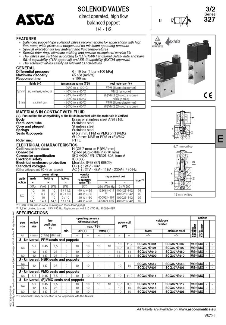 8327系列簡介: 2位3通,帶手動復位,大流量,直動式電磁閥。閥體材質(zhì):黃銅和316不銹鋼; 接口:1/4 NPT 8327 系列特點: 專用于大流量,無最小操作壓力的場合,例如:電廠、煉油廠、化工廠等;平衡提升閥結(jié)構(gòu),大流量,低功耗; PTFE導向環(huán)和石黑填充密封件,減少摩擦,無卡滯,壽命長; 316不銹鋼結(jié)構(gòu),高抗腐蝕性。常備現(xiàn)貨型號如下: WSNF8327B102 WSNFX8327B102 WSNF8327B112 WSNF8327B002 WSNF8551A422 WSNF8551A409 NF8327B112 NF8327B102 NF8327B012 NF8327B00